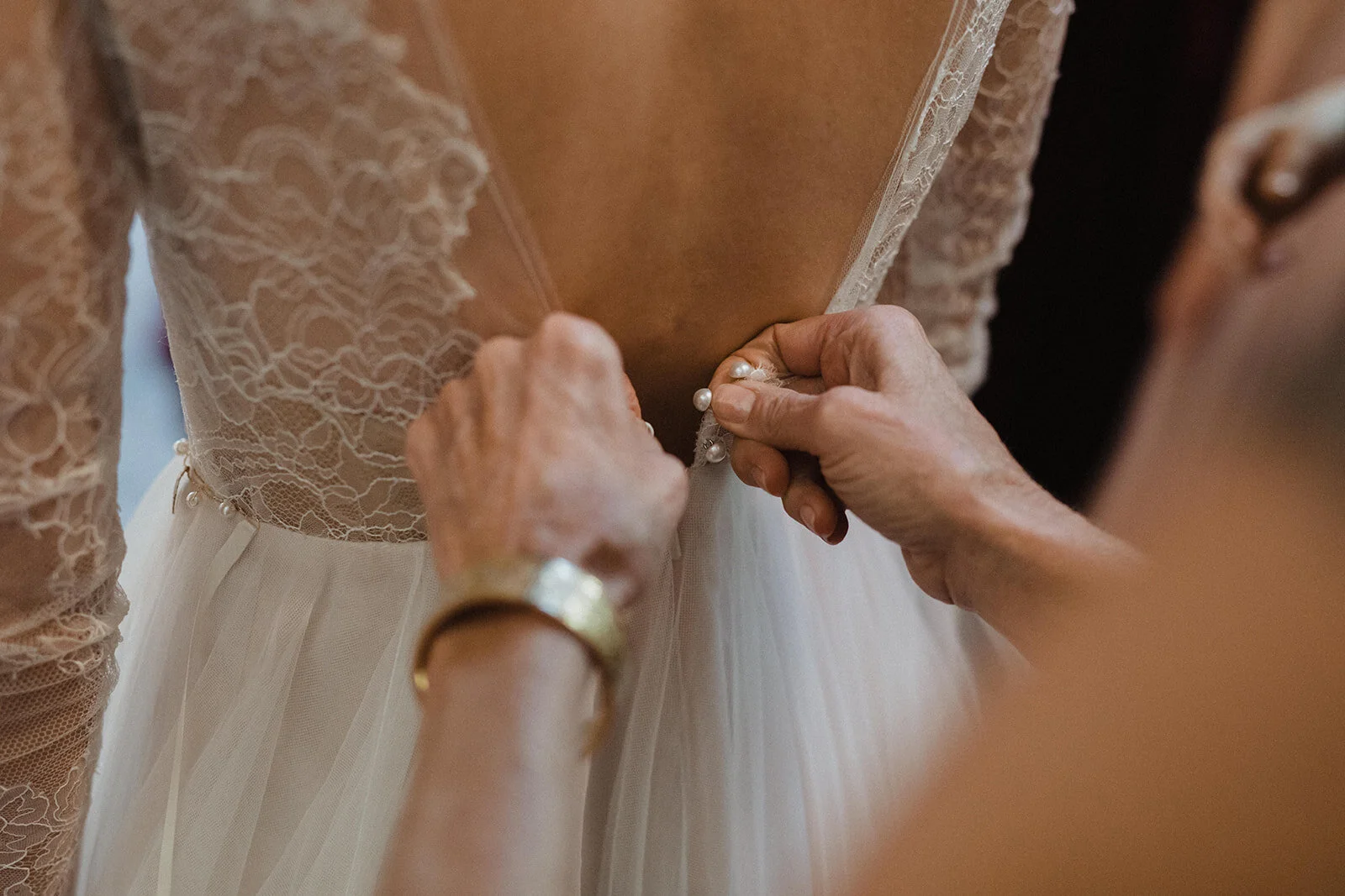 Heather’s dress was a flowy delicate lace, with full sleeves, and a pearl and gold leaf belt. With Covid making it challenging to make a bridal appointment, she found her dress online at BHLDN.